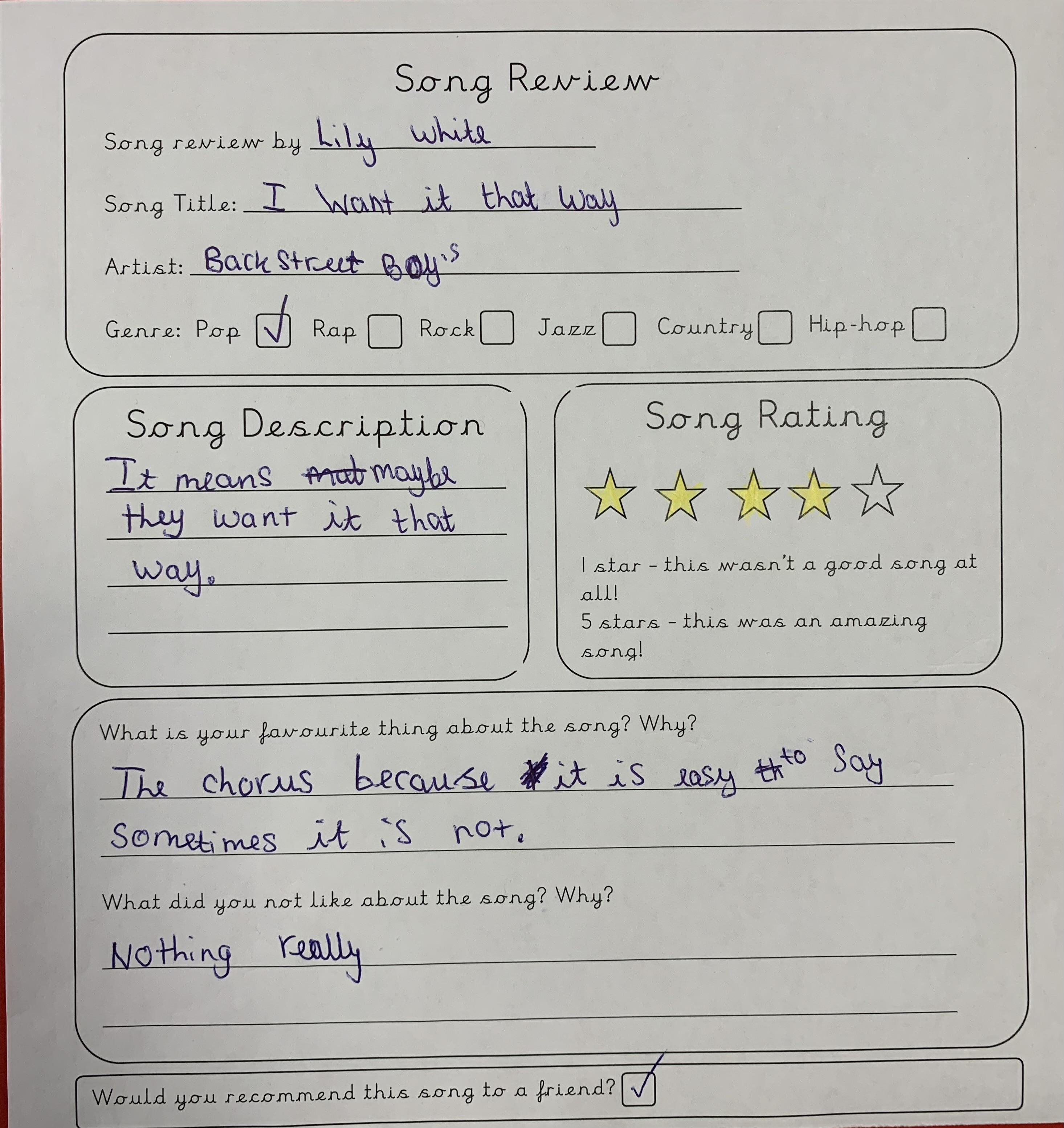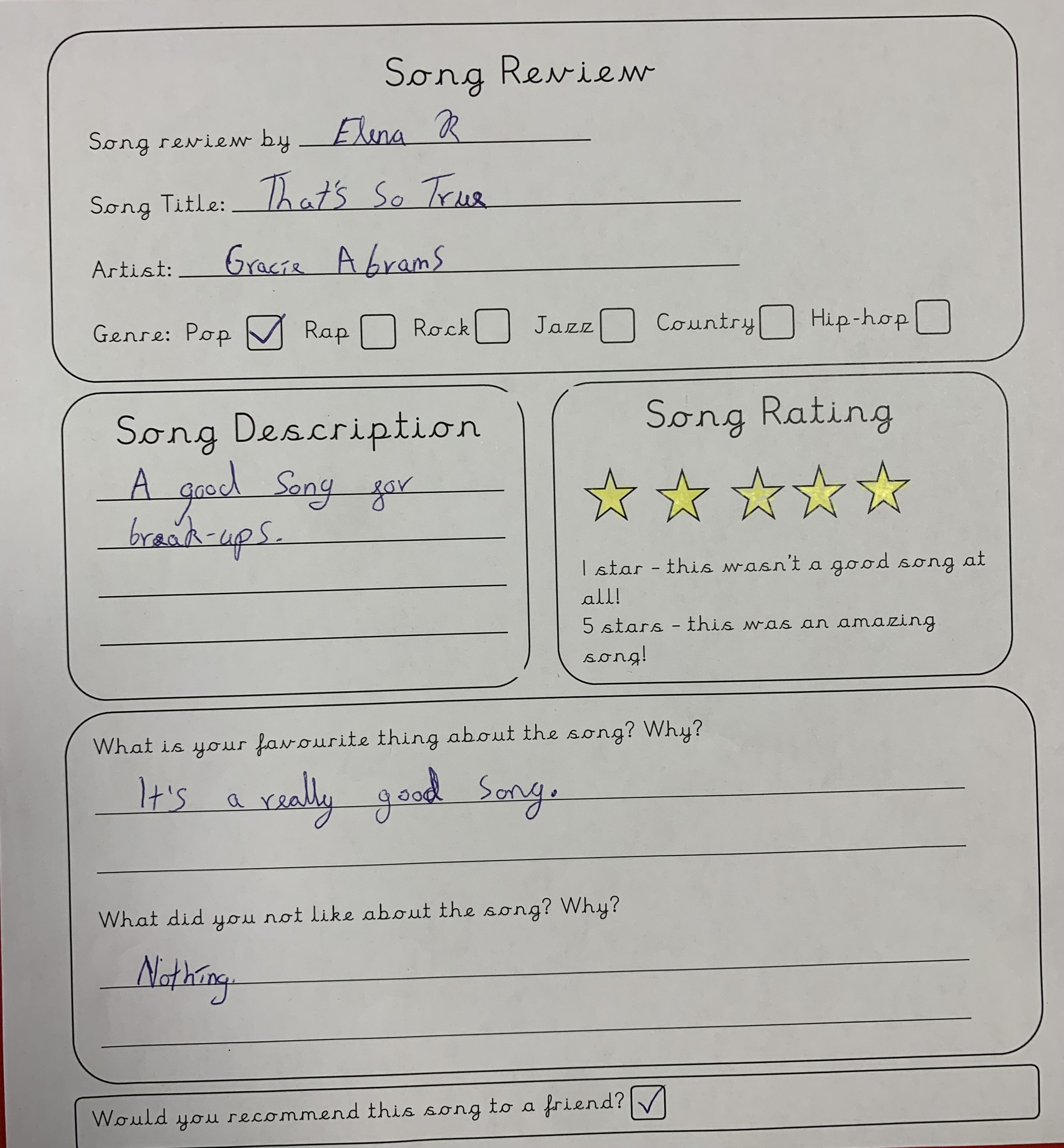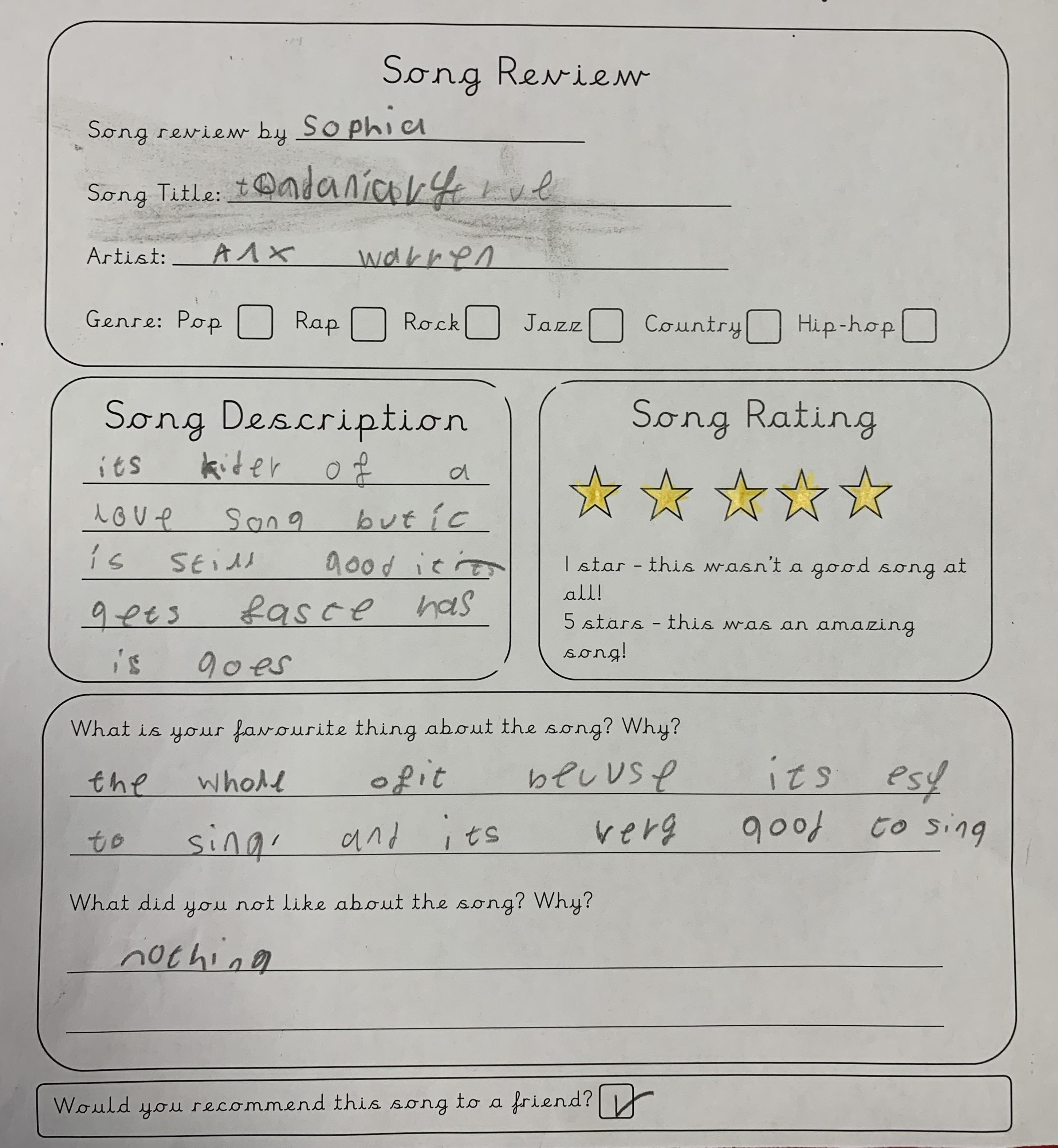 In Year 4 we celebrated World Music Day by listening to a range of songs from different years, requested by the class and the teachers. We then reviewed the song and gave them a personal rating between 1 and 5 stars. Song songs were definitely better than others...