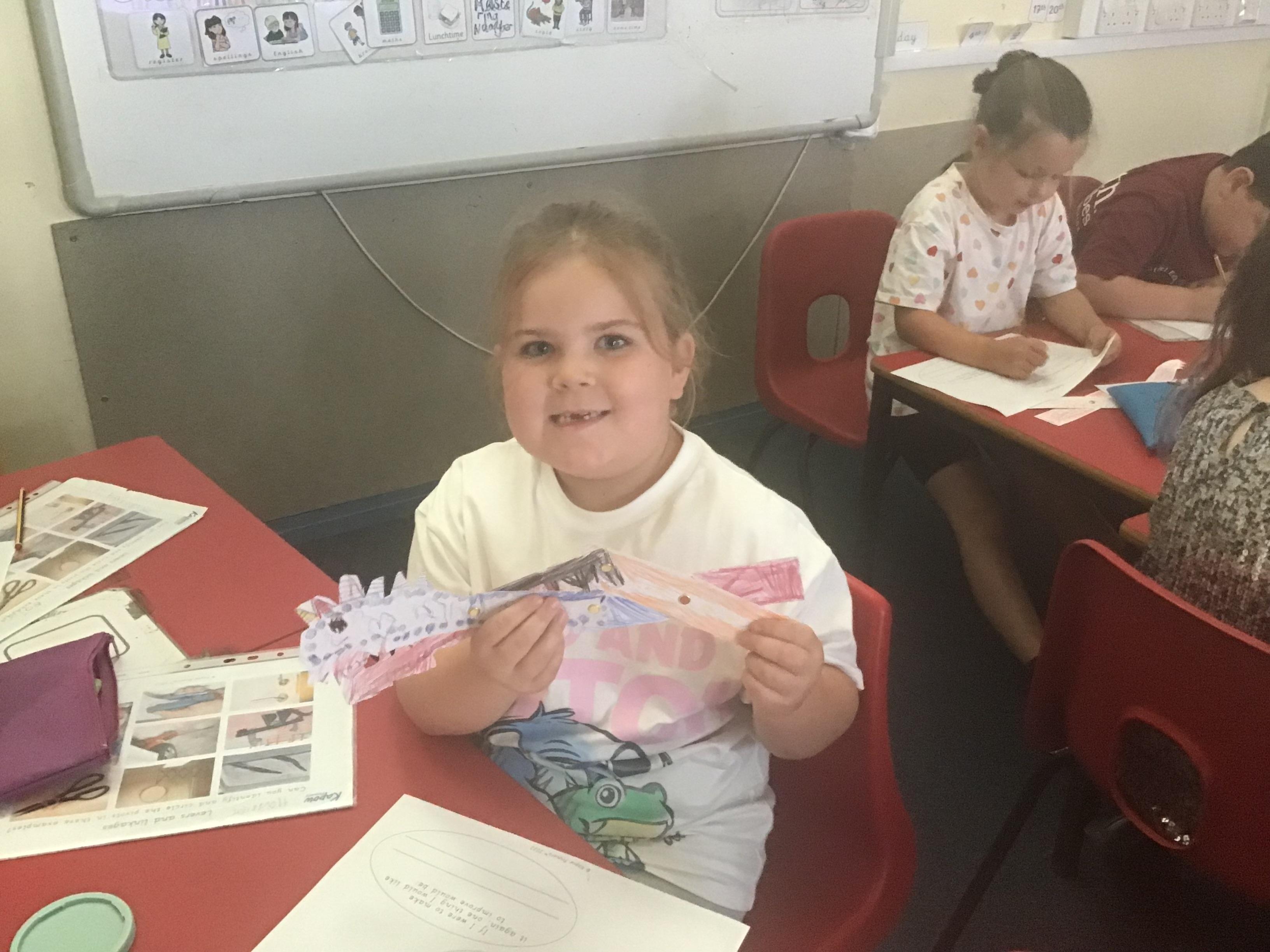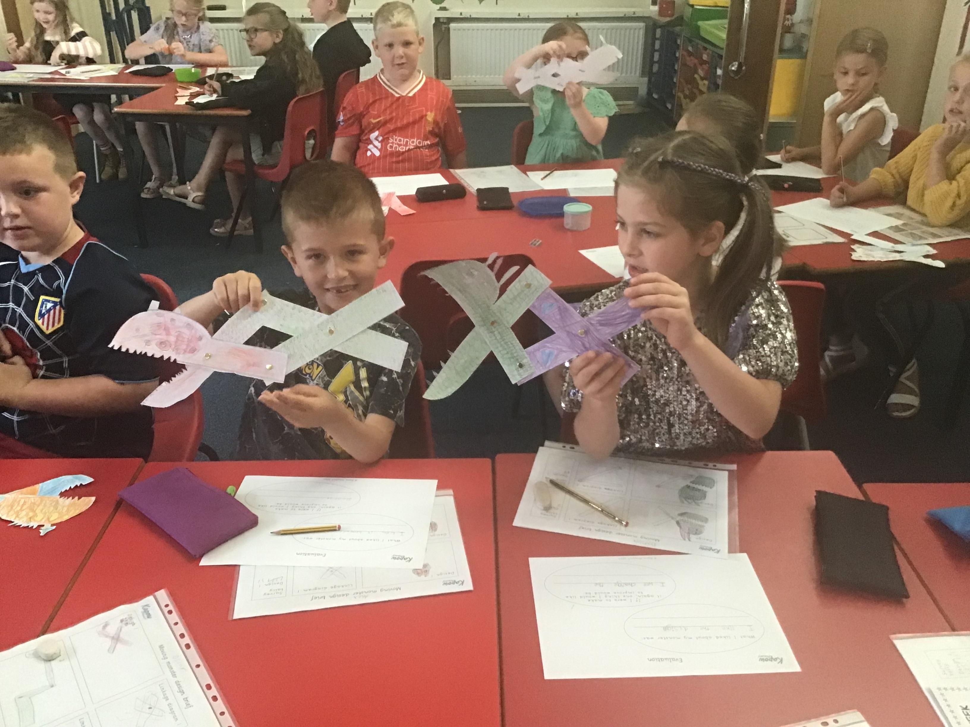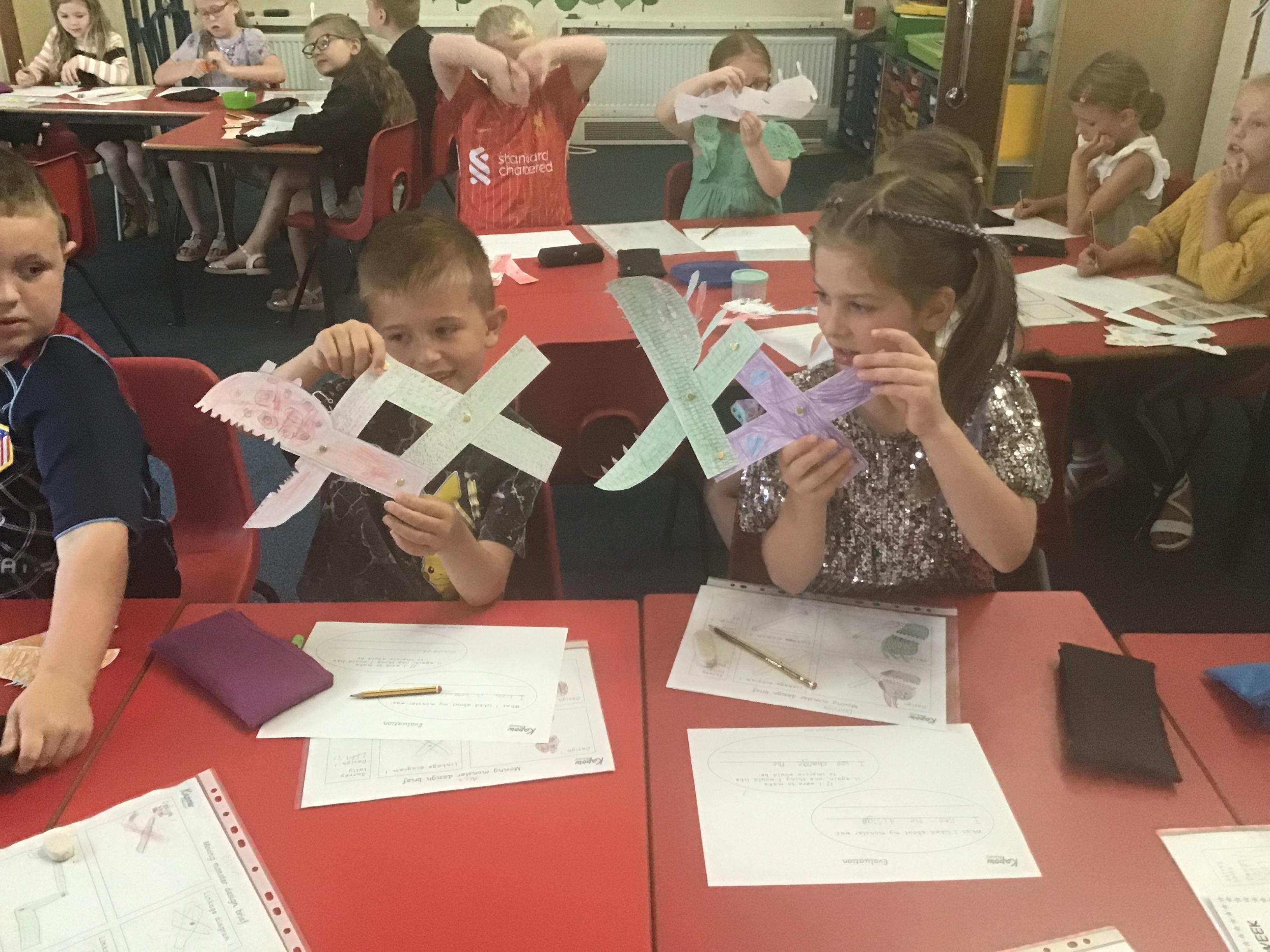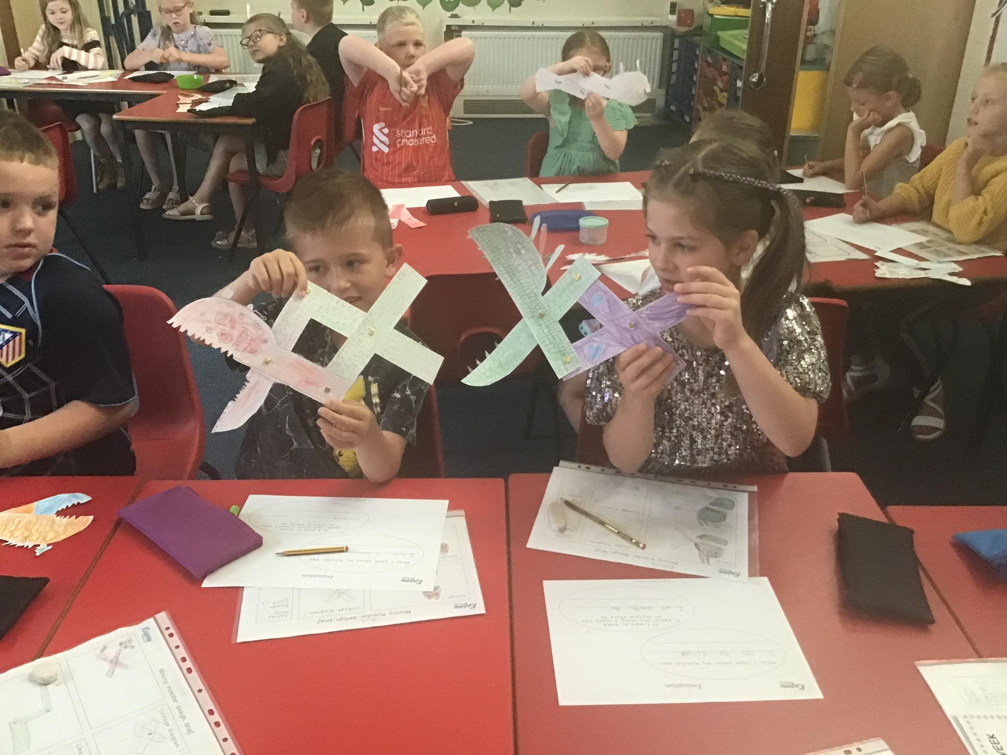 We have successfully completed all aspects of our Moving Monsters project. We began by identifying and using the correct terms for levers, linkages, and pivots, and then applied this knowledge to analyse how popular toys use these mechanisms. We designed and created functional linkages that produced the desired input and output motions. Using these mechanisms, we designed our own child-friendly monsters that met most of the design criteria. After developing two ideas, we evaluated both designs against the criteria and gathered feedback from our peers to choose the best one. We then carefully selected and assembled materials to create the features of our monsters. Finally, we attached our monsters to the linkages, ensuring that their movements remained functional and effective throughout. We will use our new knowledge to support our English project.