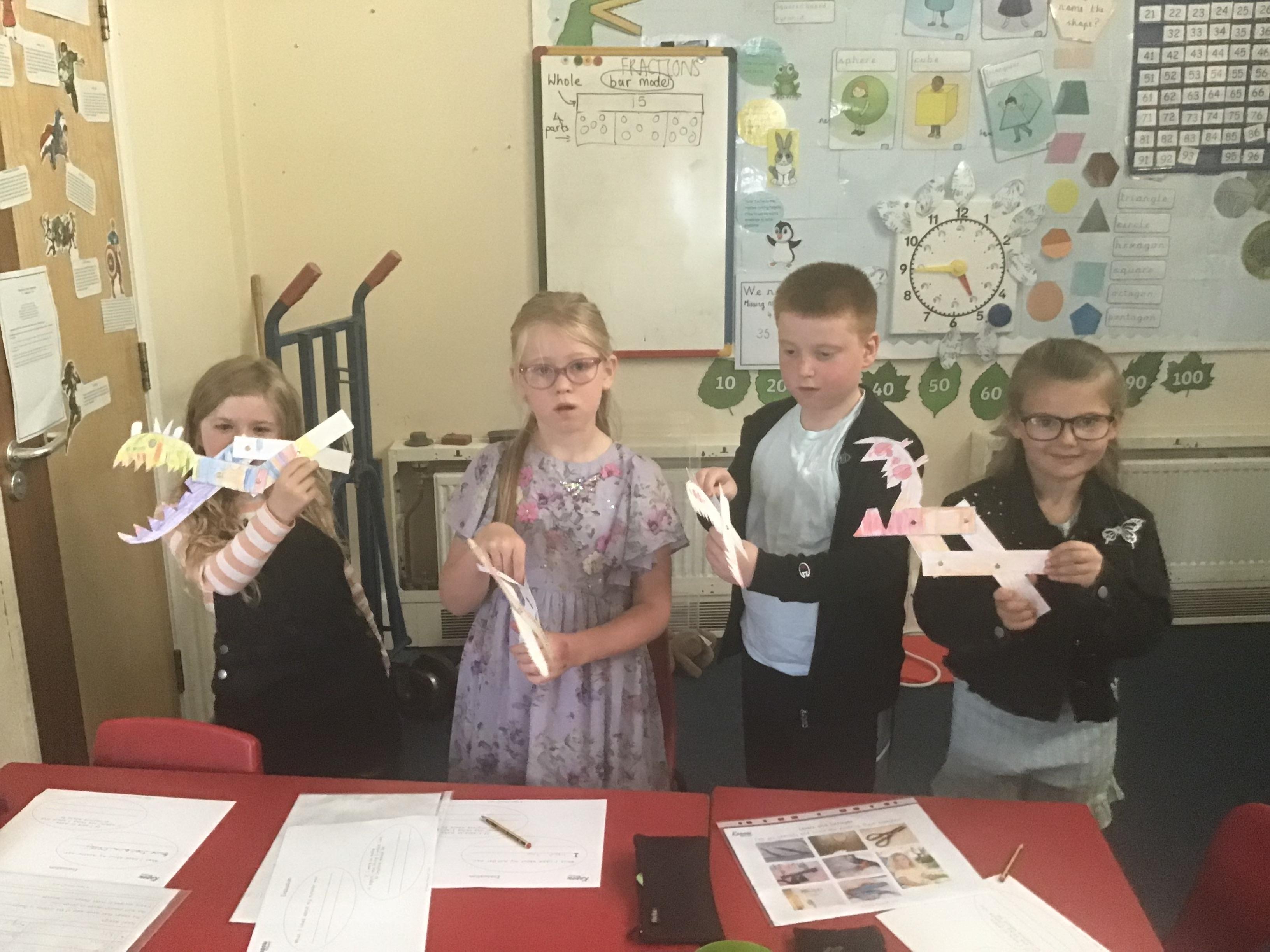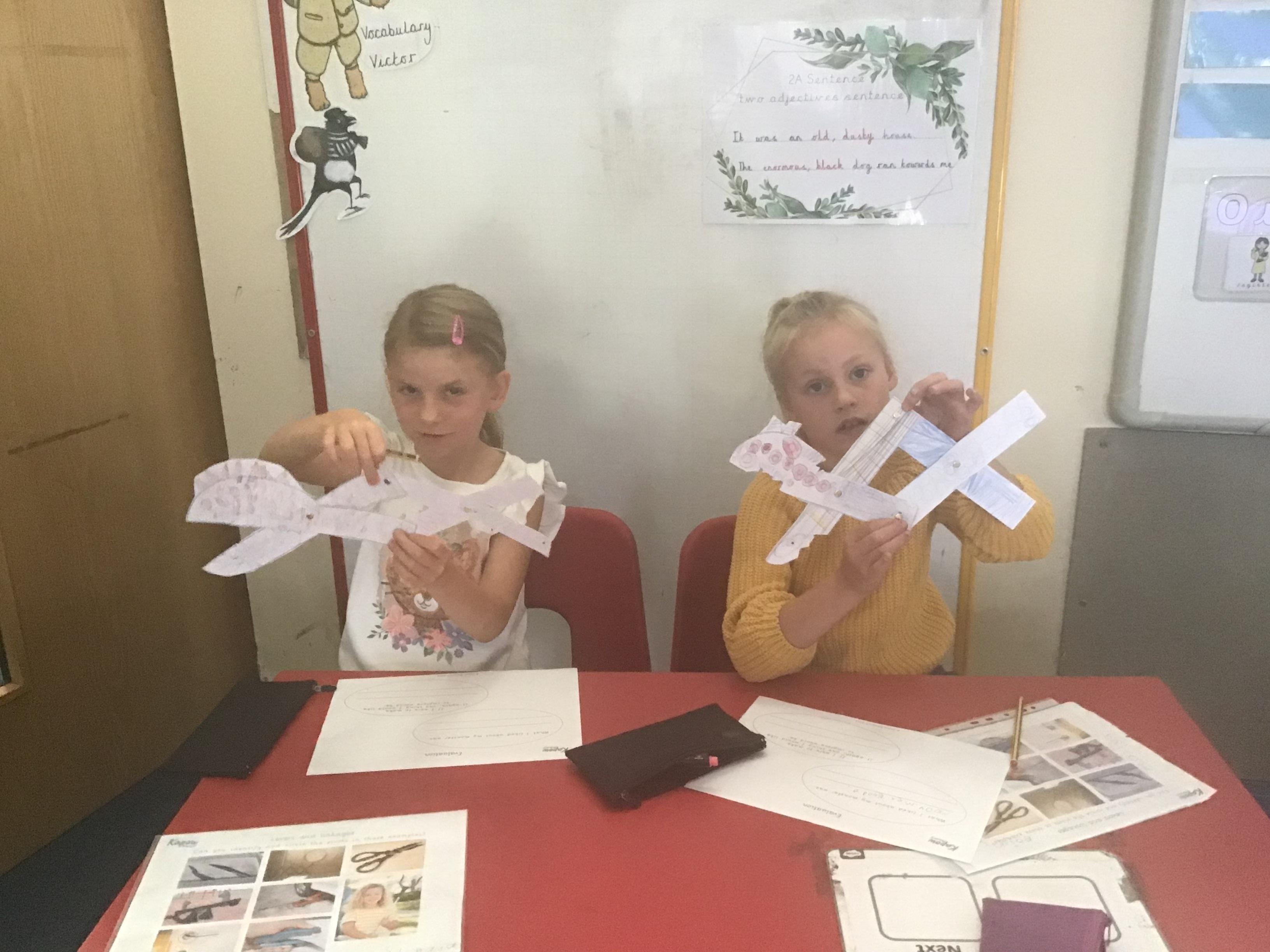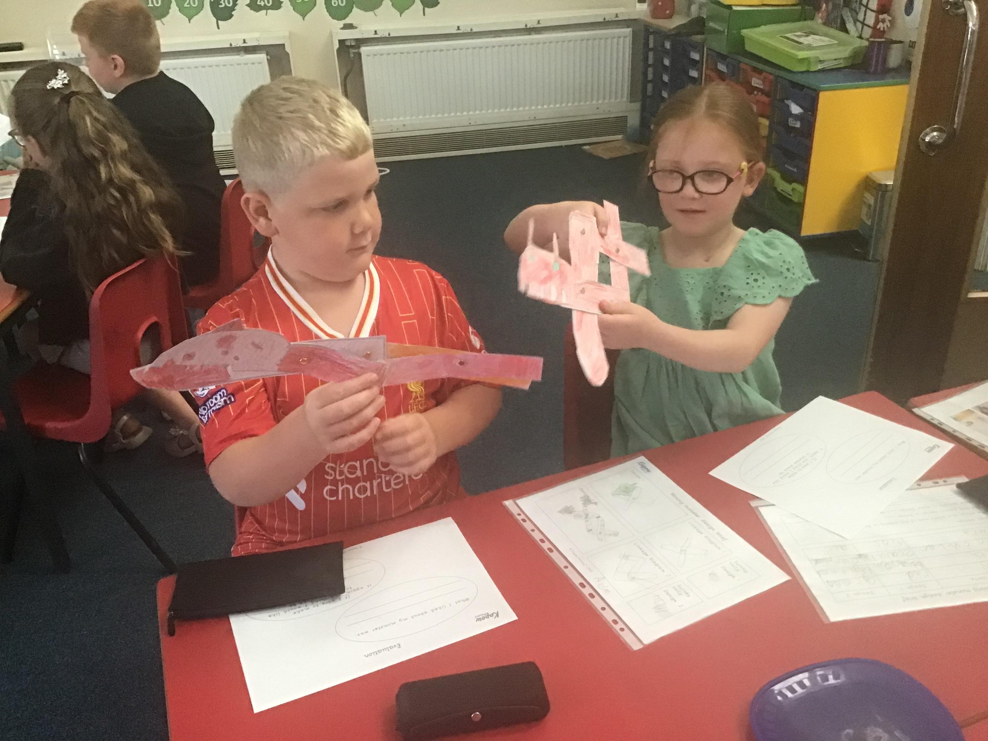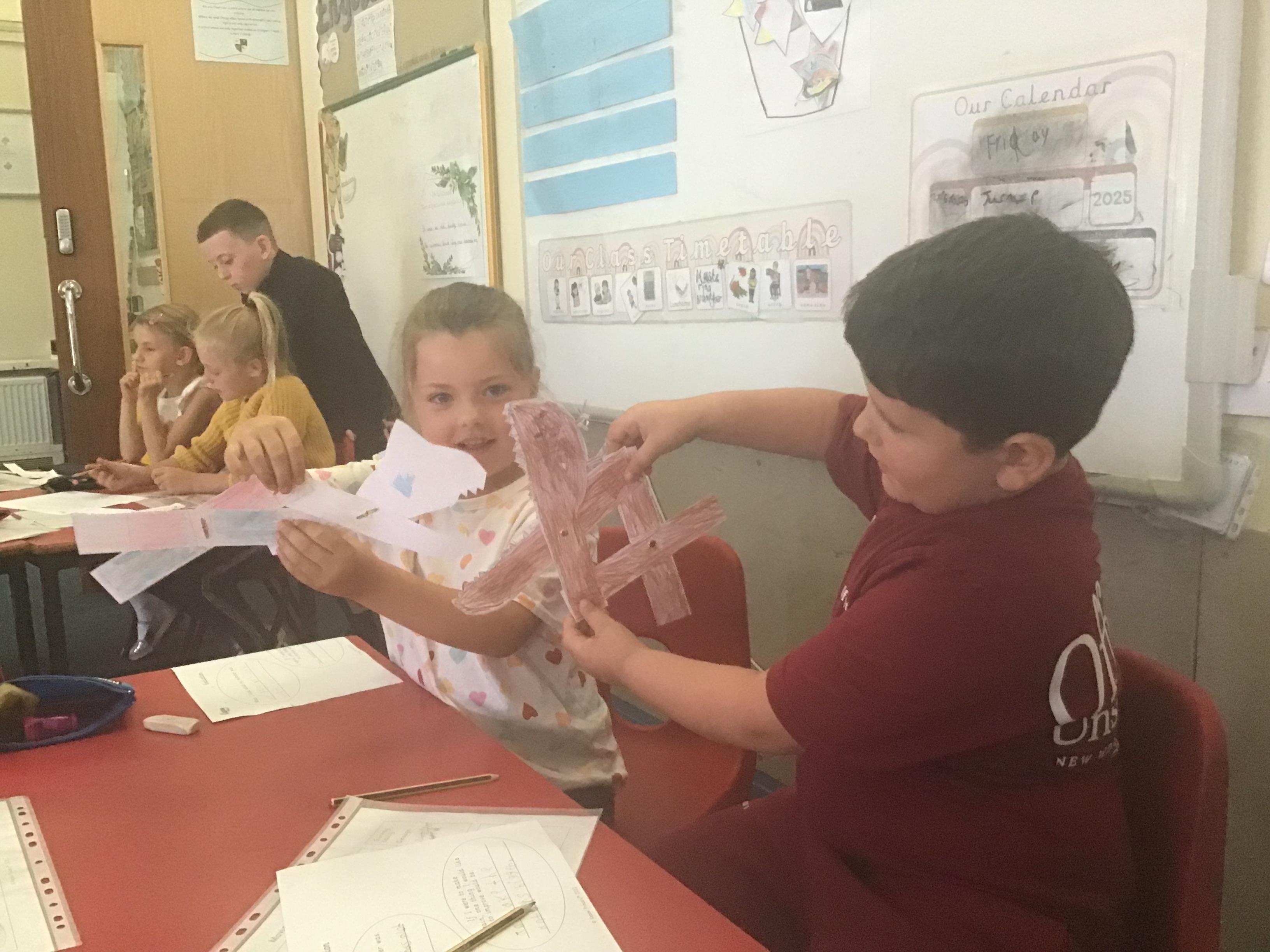 For DT day, Year 3 made some fabulous aeroplanes out of card. They also made a launcher which required a mechanism made from an elastic band to make them fly. They decorated the planes and launchers, making them look as realistic as possible.