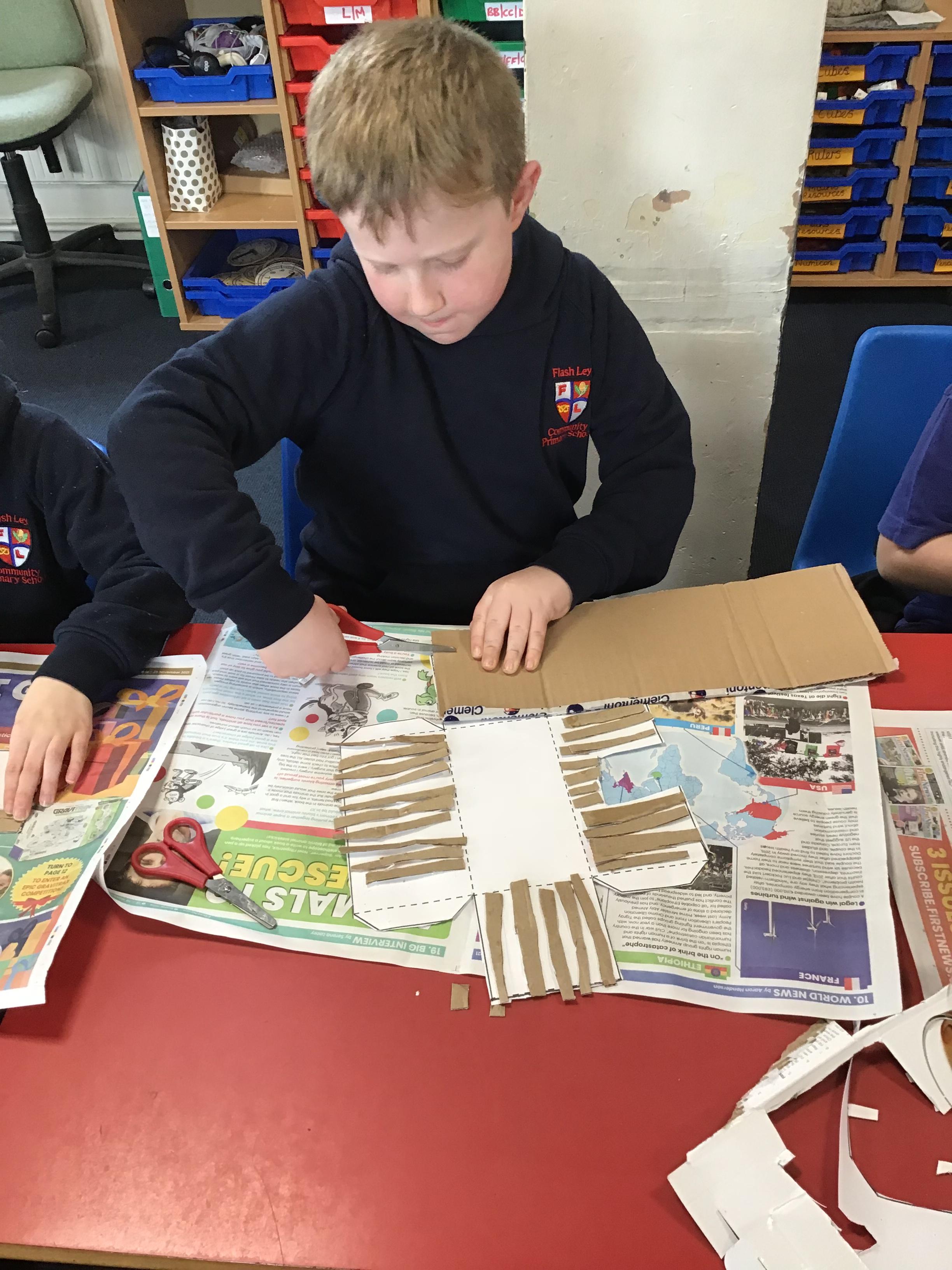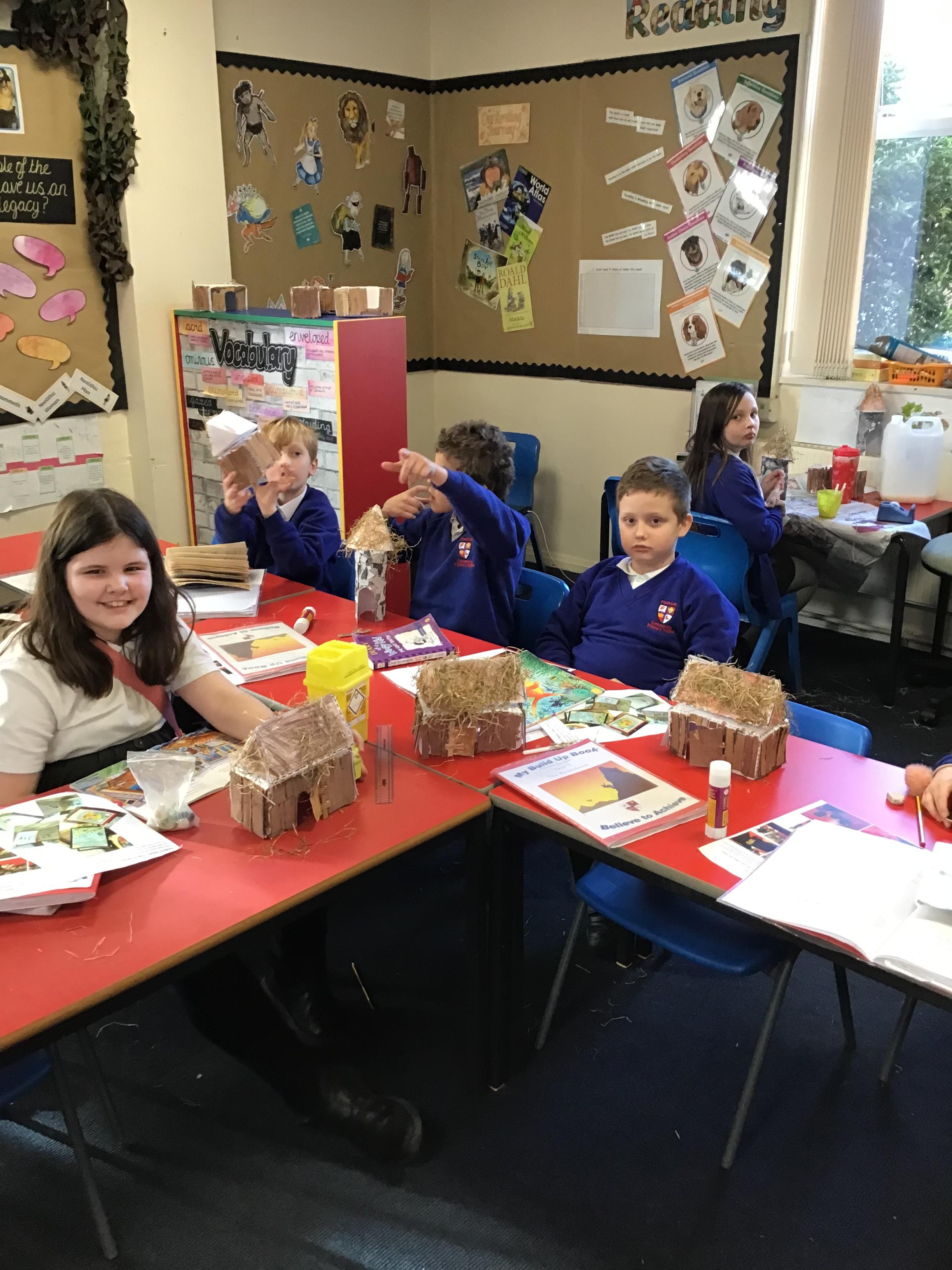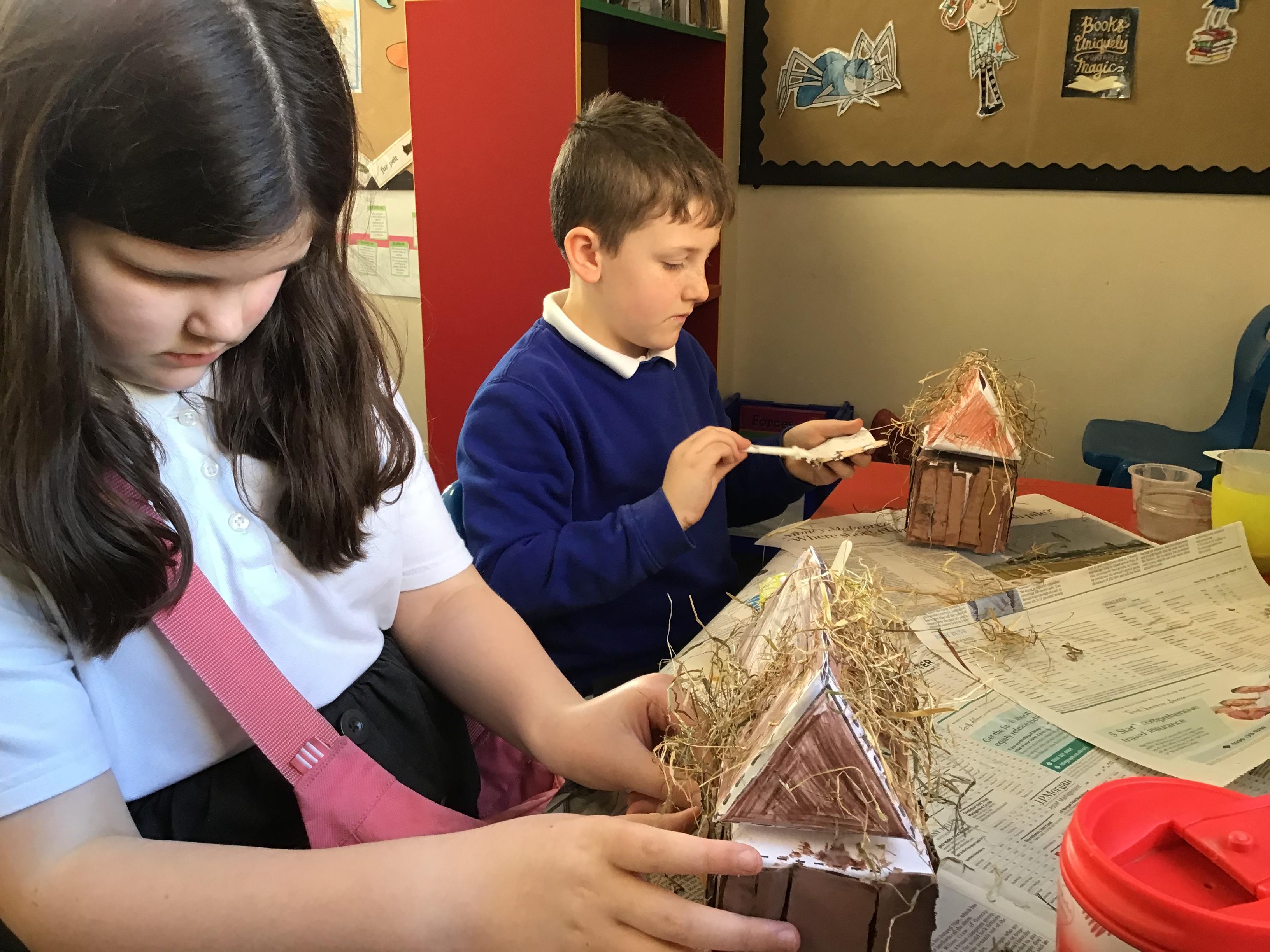 Year 3 are currently learning about the Stone Age for their topic and for DT they constructed Stone Age round houses and long houses. This included using nets to make the main parts of the houses and making and painting stones or logs out of cardboard to attach to the walls, in order to make houses appear realistic. They also made a door with a frame that could be opened or closed. Finally, straw was glued onto the roofs to show the thatched effect that was used at the time.