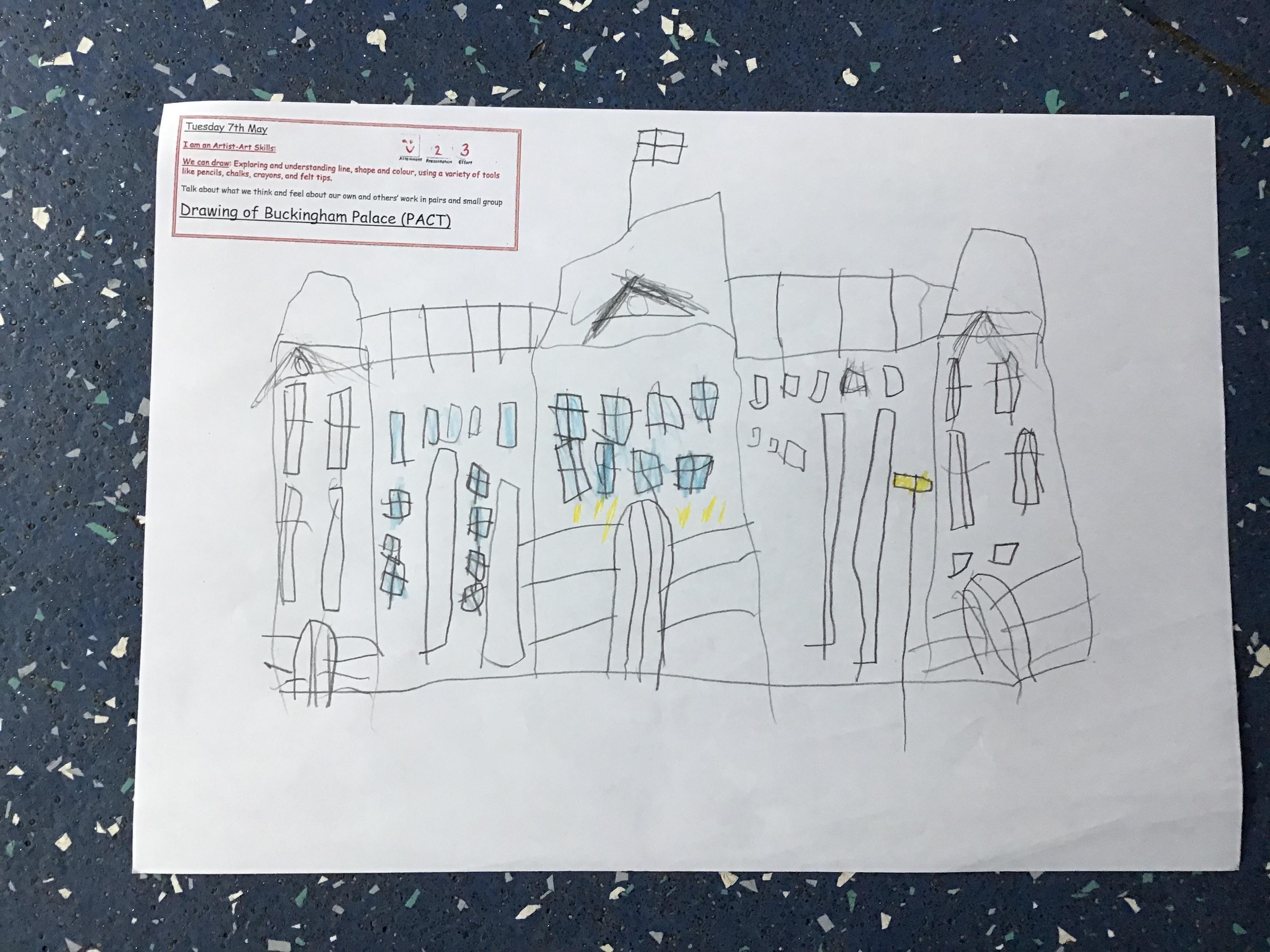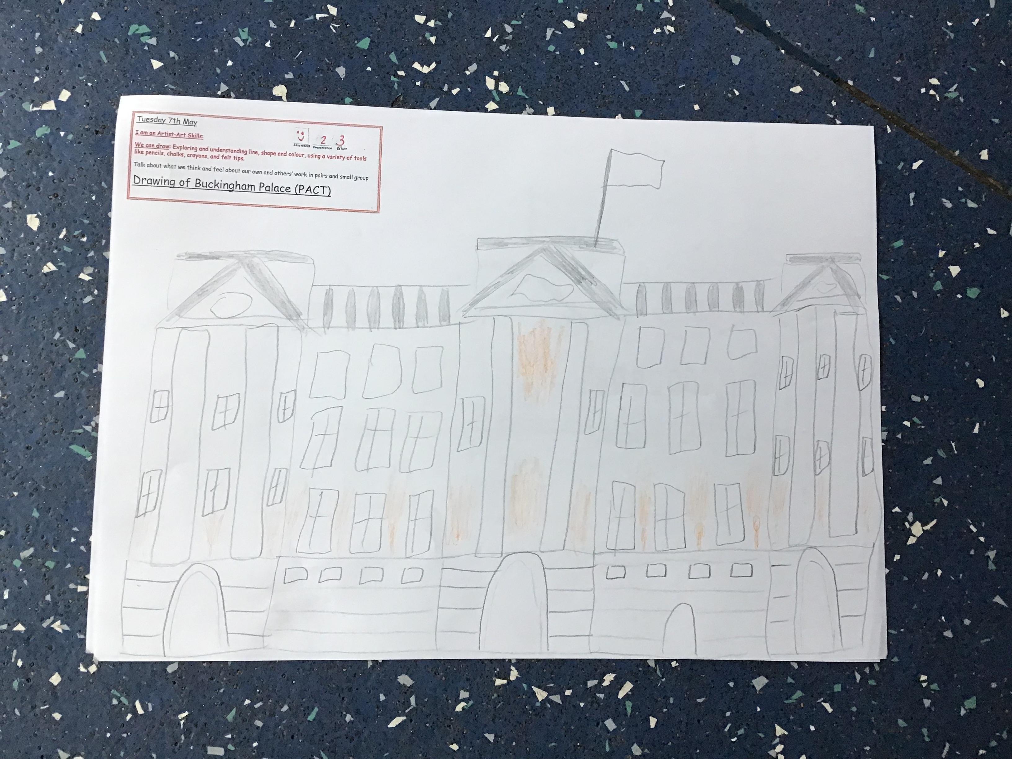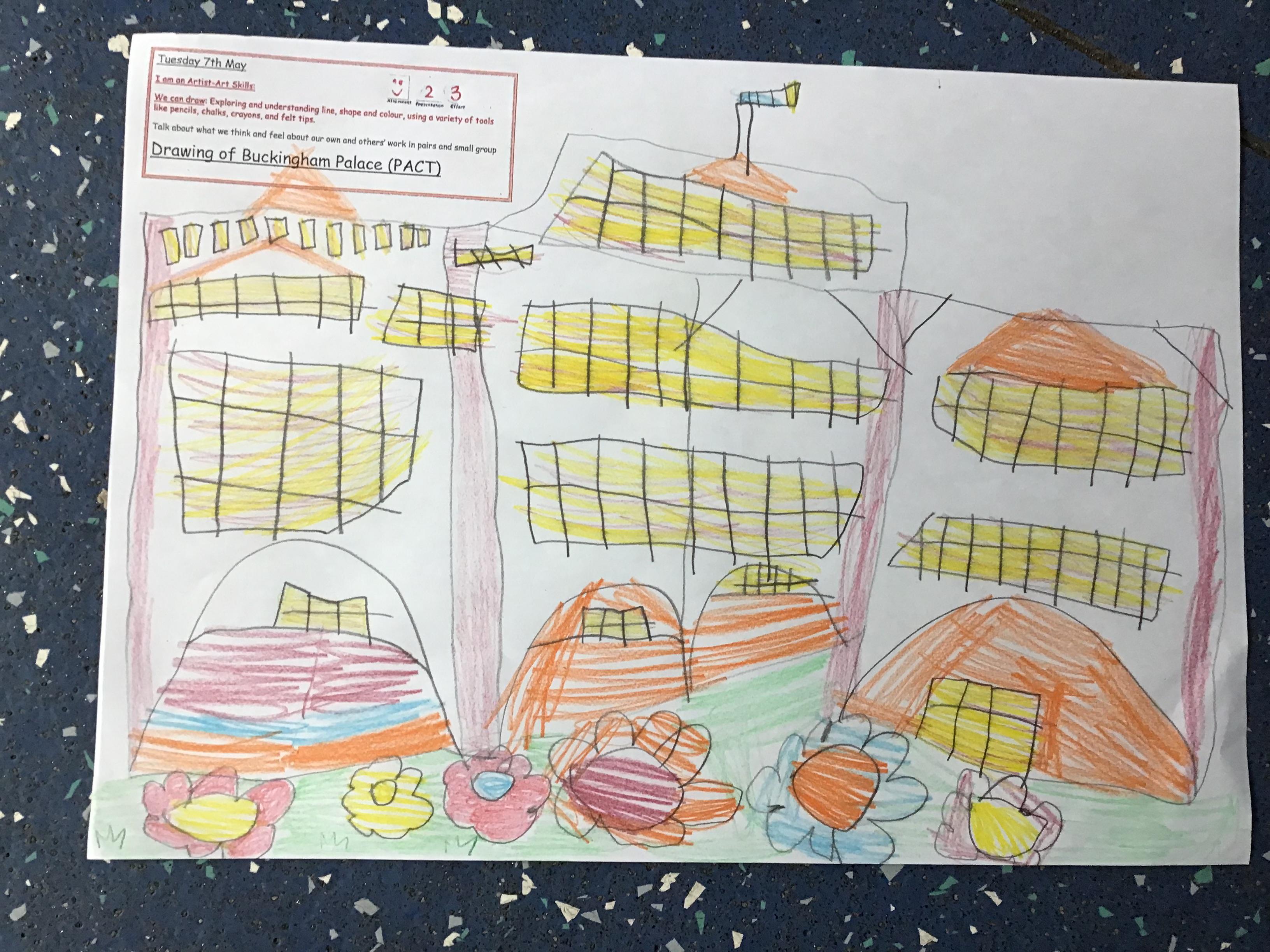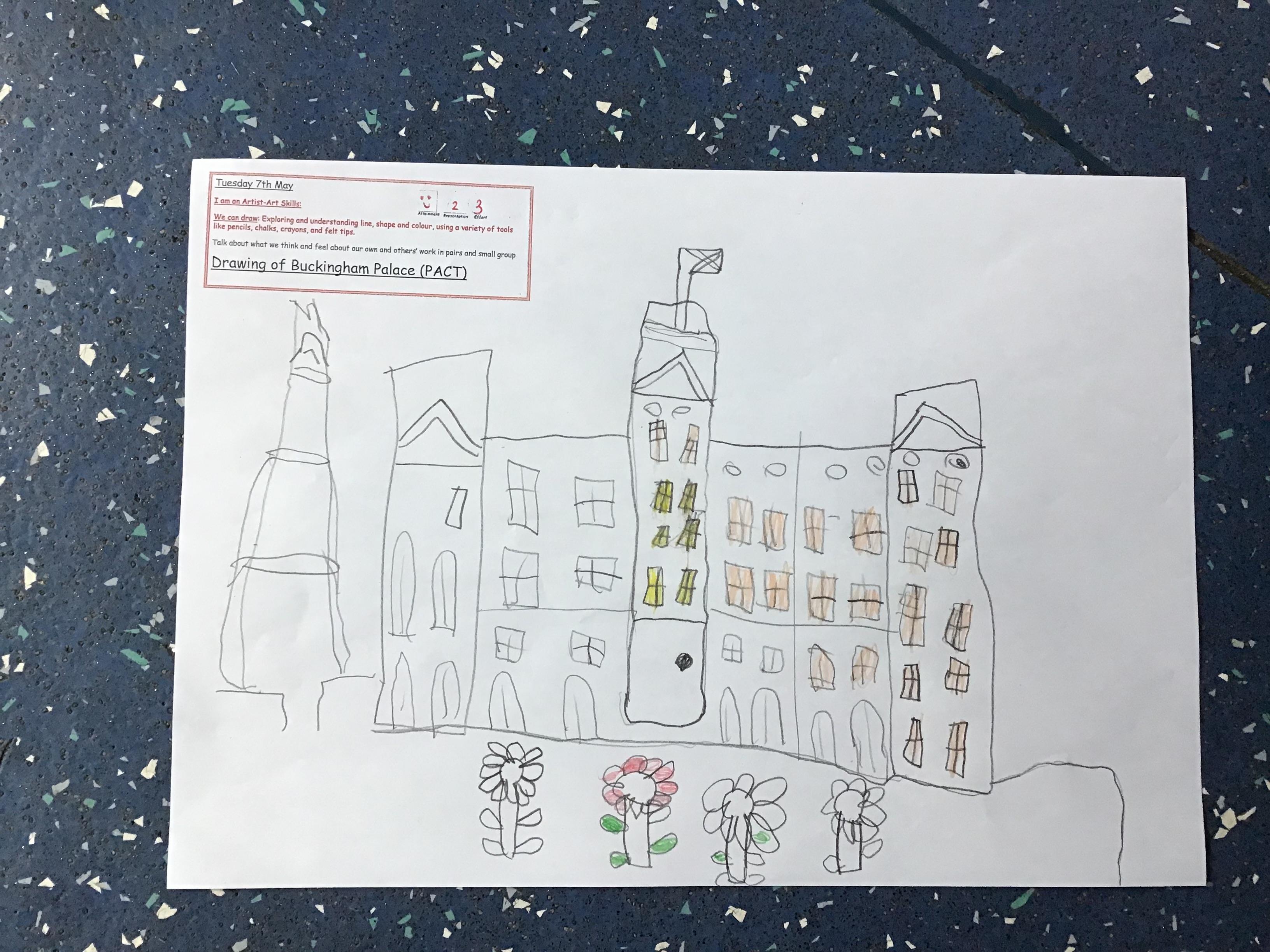 As part of Topic Queen Elizabeth II we learnt about Her home Buckingham Palace, did a quiz with the help from our adults and then drew a picture of the Palace using our Art Skills