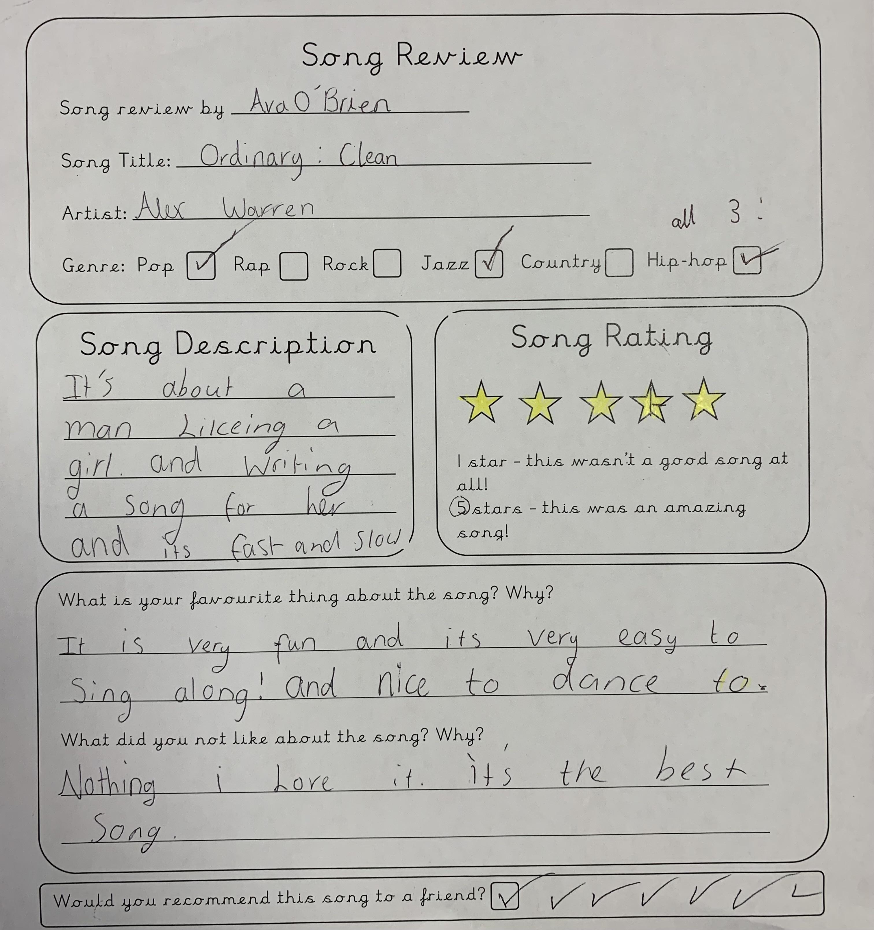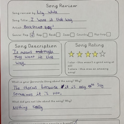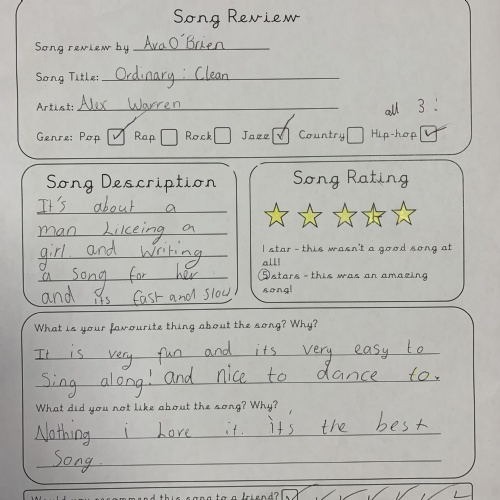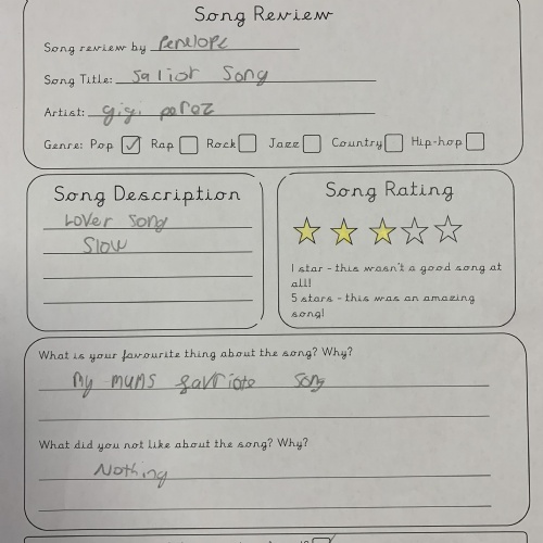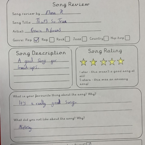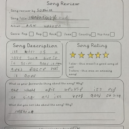 In Year 4 we celebrated World Music Day by listening to a range of songs from different years, requested by the class and the teachers. We then reviewed the song and gave them a personal rating between 1 and 5 stars. Song songs were definitely better than others...